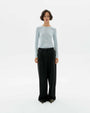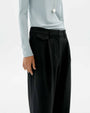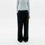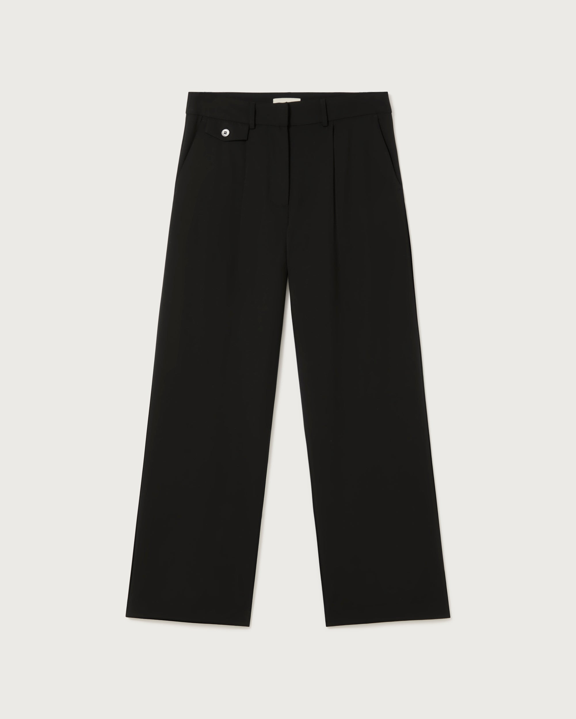 Svarta ullbyxor med låg midja & stretch & vida ben. Liten extraficka med knapp på vänster sida midja. Modellen är 177 cm lång och bär storlek 36.