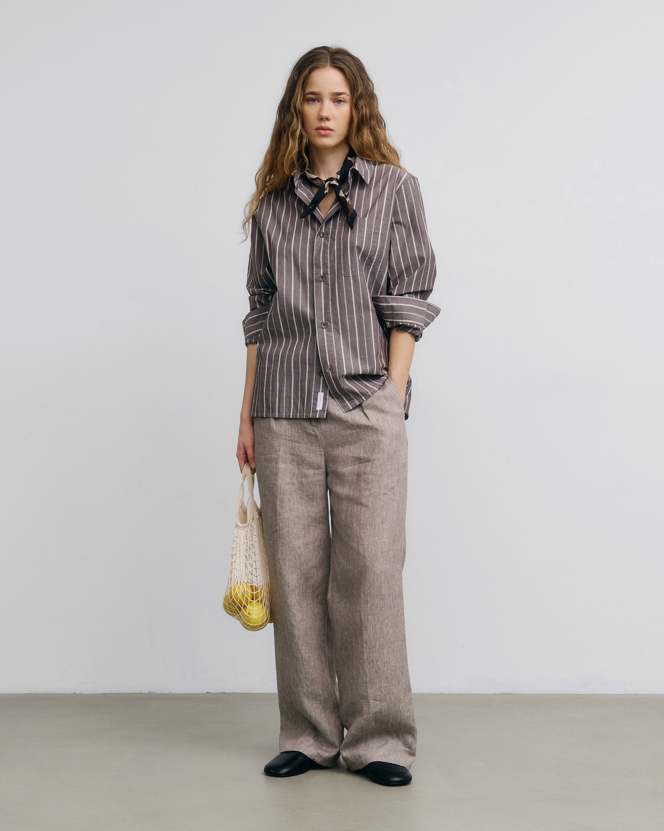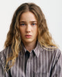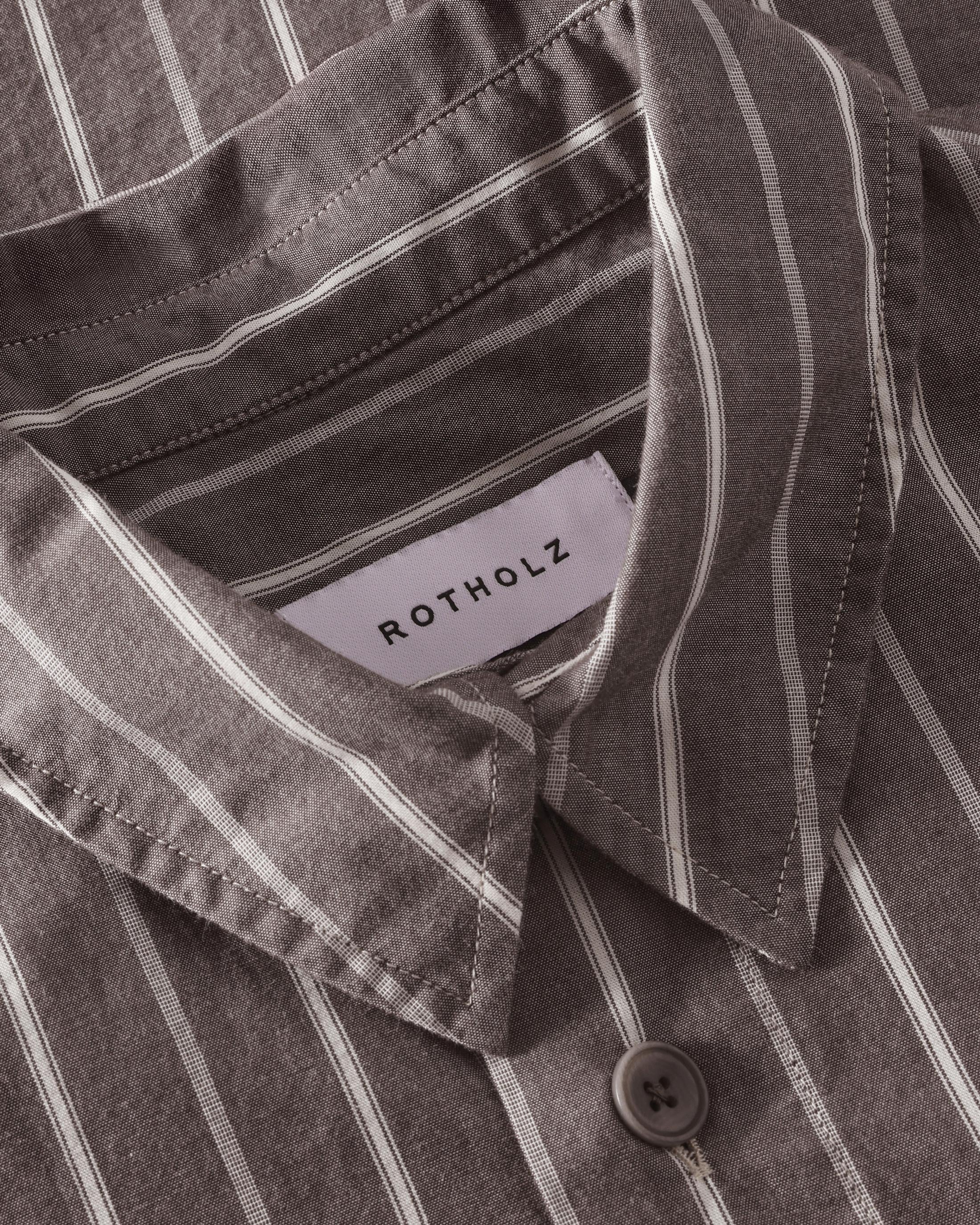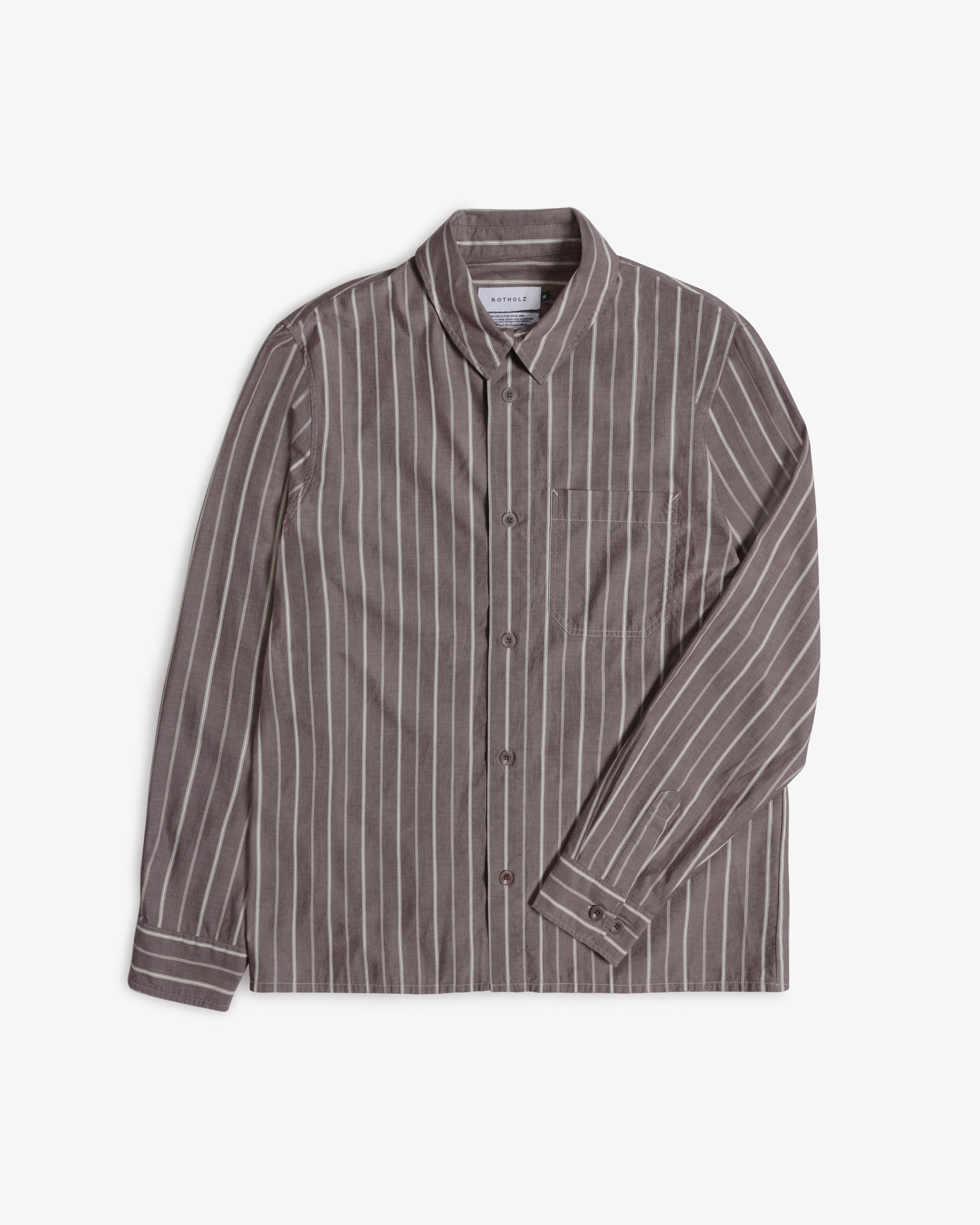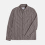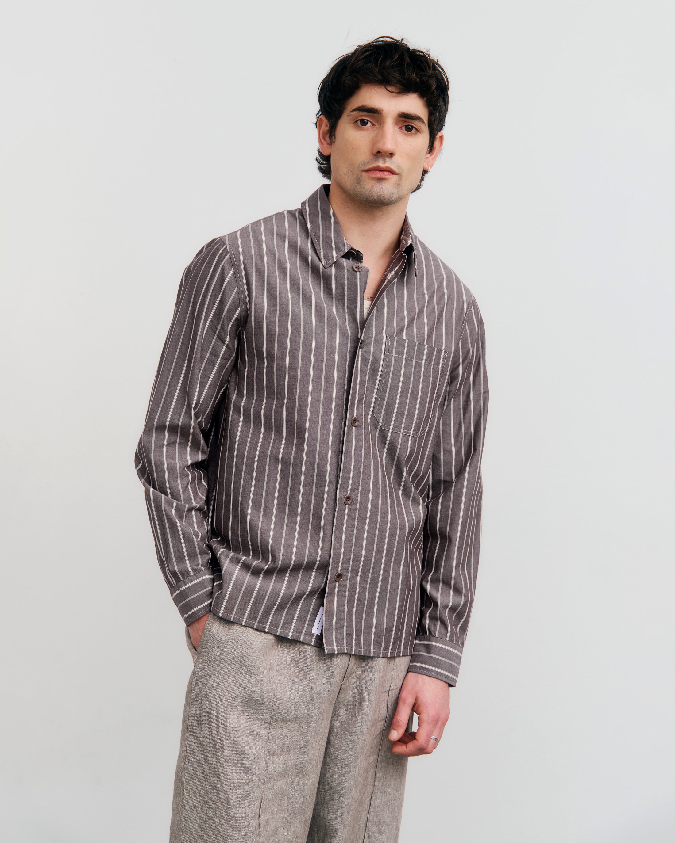 En avslappnad skjorta med rak fåll och en påsydd bröstficka. Handgjord i Portugal av ett brunt & vitrandigt ekologiskt bomullstyg.