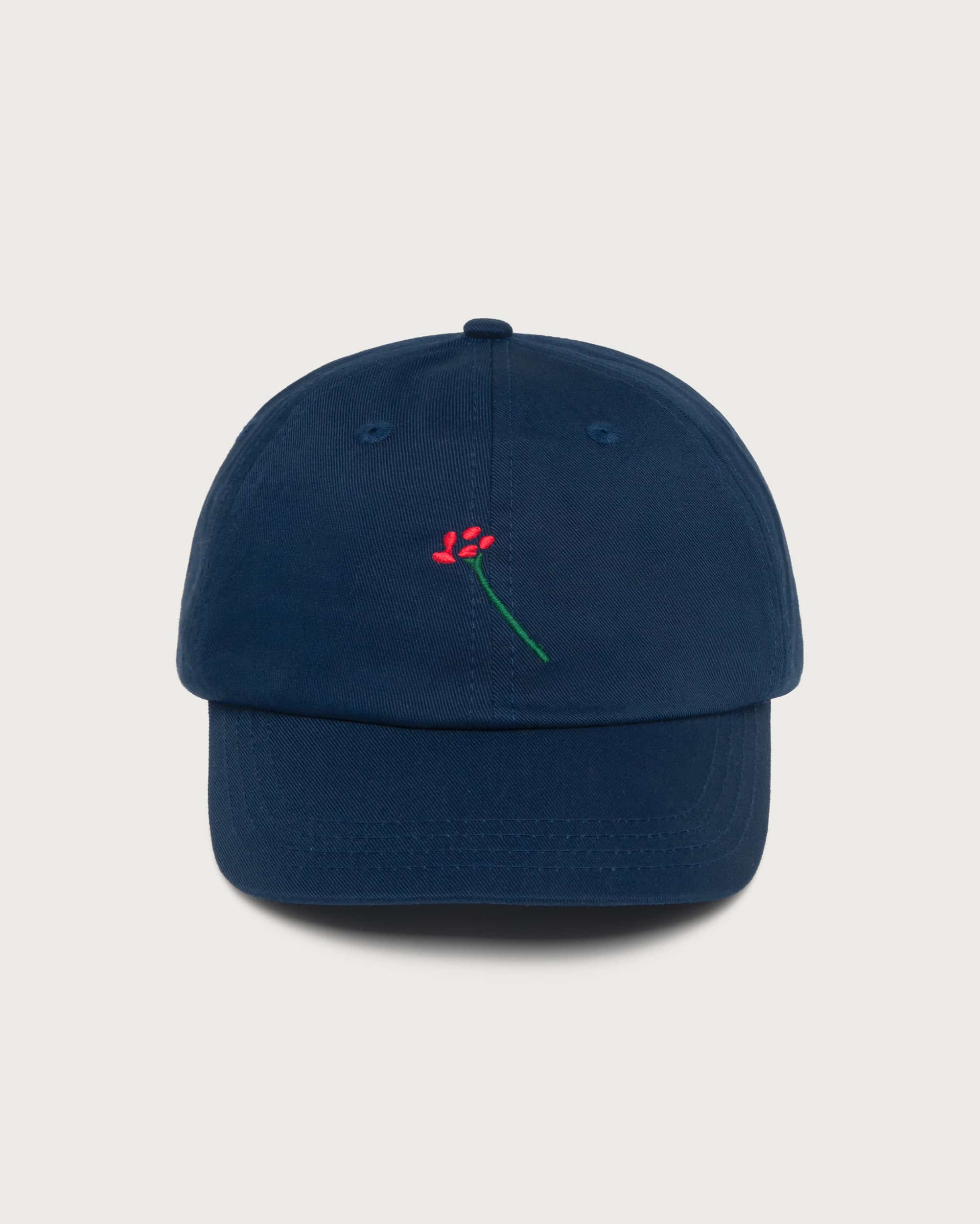 00% ekologisk bomull i denna mörkblå kepa från Thinking Mu med broderad blomma i rött.