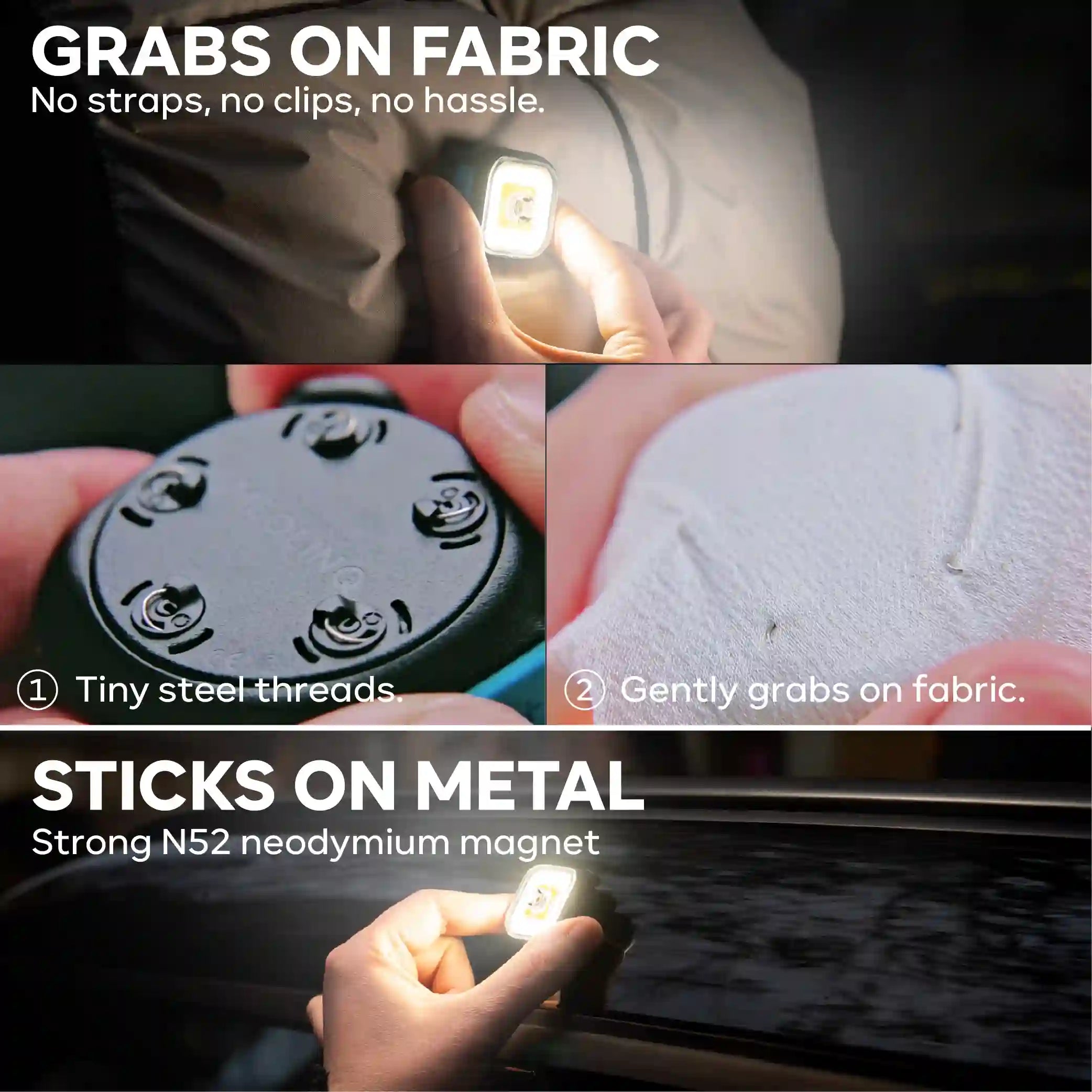 Meolinq Light 01 har ett patenterat ståltrådsfästsystem som gör monteringen lika enkel som genial: ljuset fästs direkt på kläder, ryggsäckar, selar eller annan utrustning – helt utan remmar, clips eller risk för skador på tyget.