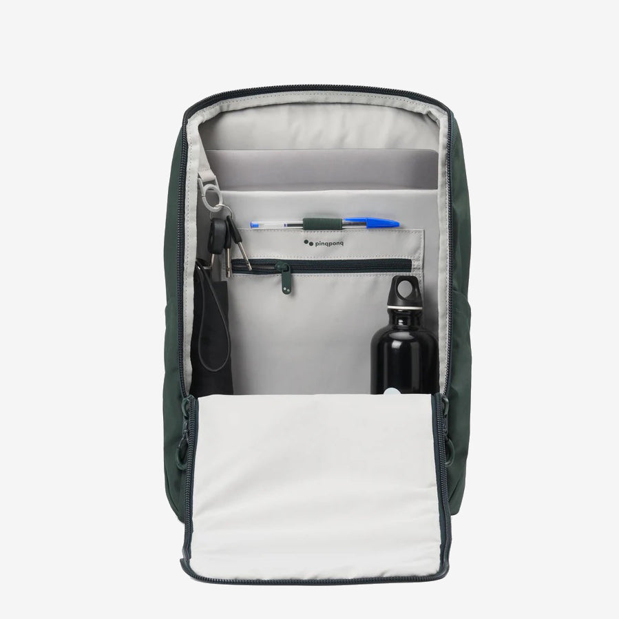 Purik Cosmo Green Vegan från Pinqponq är en lite mer avskalad & betydligt lättare modell. En mörkgrön ryggsäck med hög funktionalitet men få detaljer - en mer asketisk Pinqponq! Materialet är 100% återvunnet PET, vattenavvisande och riktigt slitsarkt. En stor skillnad från mer komplicerade ryggsäckar från Pinqponq är at Purik har rena, enkla axelremmar utan bröstspännen - riktigt cleana!