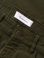 Klassiska herrbyxor med stretchkanvas i ekologisk bomull. Mörkgröna byxor med 5st fickor & en avslappnad passfrom med något avsmalnande ben.